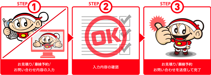 お電話もしくはフォームからお見積り・車検予約・お問い合わせ頂けます。後ほど担当者が対応させて頂きます。